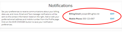 Tenga en cuenta que la dirección de correo electrónico que figura en la parte superior derecha de la página es la que se utilizará para enviarle las notificaciones por ese medio. De la misma manera, el número de teléfono celular que figura en la parte superior derecha es donde recibirá las notificaciones por SMS si usted elige recibir alertas de HughesNet por ese medio.