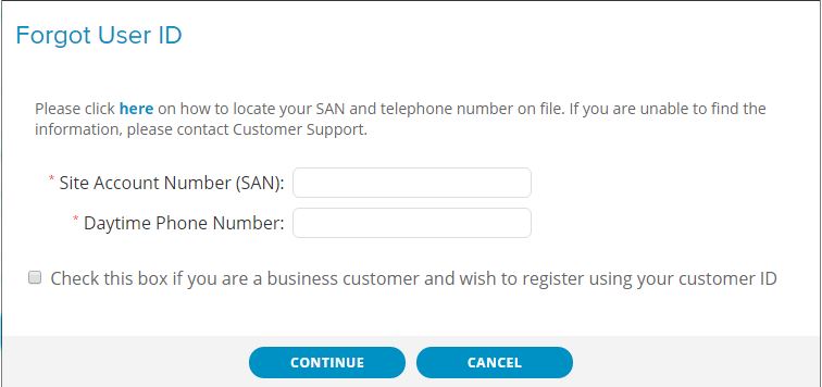 2. Se le pedirá ingresar su Número de Cuenta del Sitio (SAN) y el código postal proporcionado para su cuenta antes de continuar. Si no puede localizar su SAN y desconoce el número asociado a su cuenta, comuníquese con Atención al Cliente al 800 953 0237.