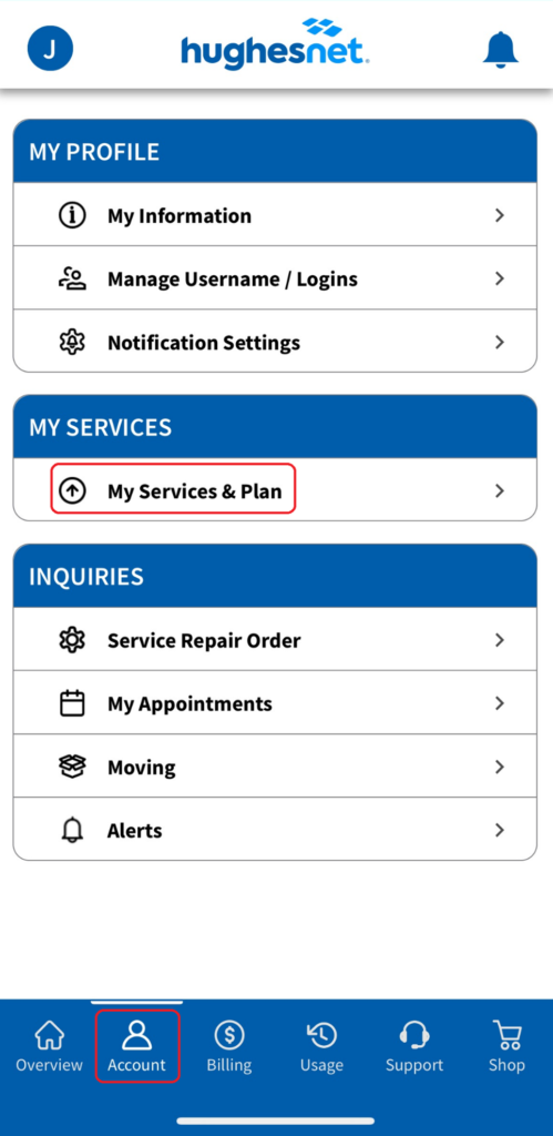 Once you are logged in to the myHughesnet (Mobile) App, click ‘Account’ on the bottom menu to see ‘My Services & Plan’.